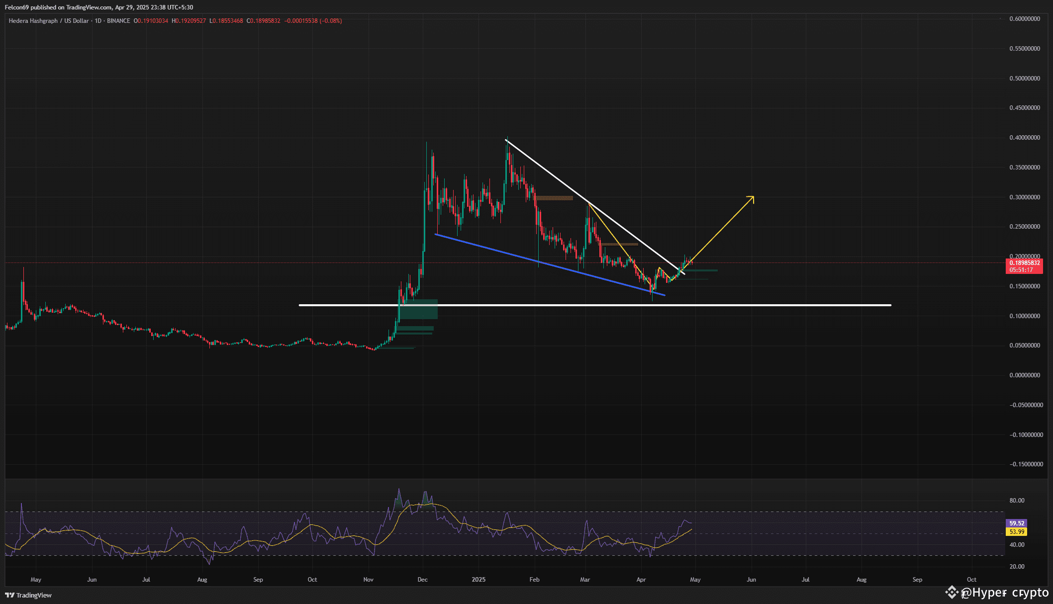 1) I can see this is the HBAR 1-day chart. The price has recently formed a descending triangle and is now breaking out of it, suggesting a potential bullish reversal 📈. The price is also approaching a significant support level near 0.1500, which has held in the past 🔒. The RSI is currently above 50, indicating positive momentum. There is a bullish breakout happening, and the price could head toward the 0.2500-0.3000 range if the upward trend continues 🚀.