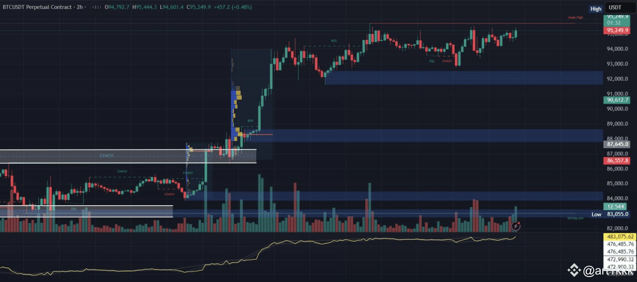 - Weak High at $95,250: resistance zone where sellers still defend.