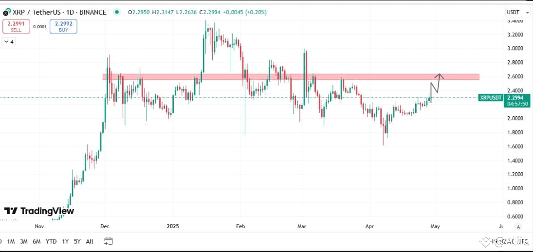 XRP is approaching a major resistance zone around $2.60–$2.75, highlighted by a red supply area on the chart.