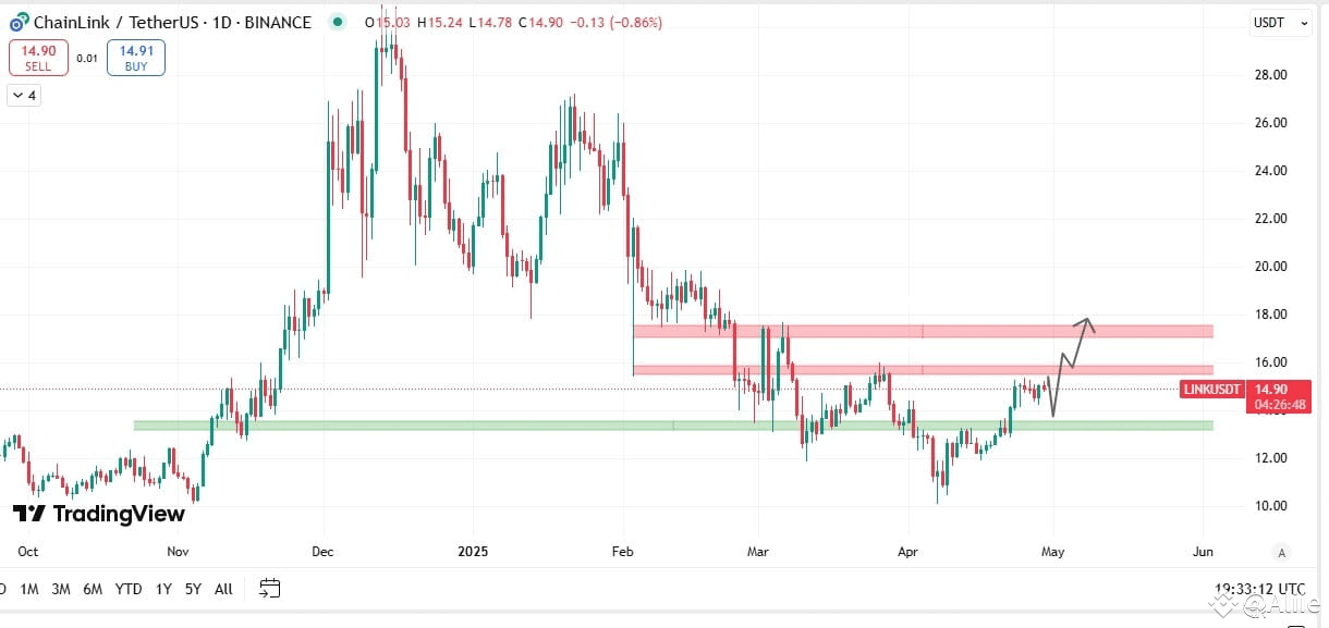 ChainLink (LINK) is currently trading near $14.90, testing a crucial resistance zone between $15.50–$16.30. A breakout above this zone could send LINK towards the next major resistance near $17.80–$18.50.