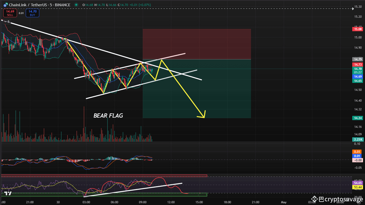 LINK is currently forming a bear flag pattern on the 5-minute chart. I expect a move up toward the $14.80 region to tap into the bearish order block. Additionally, RSI is approaching the supply zone, which adds confluence to a potential short setup around that level.