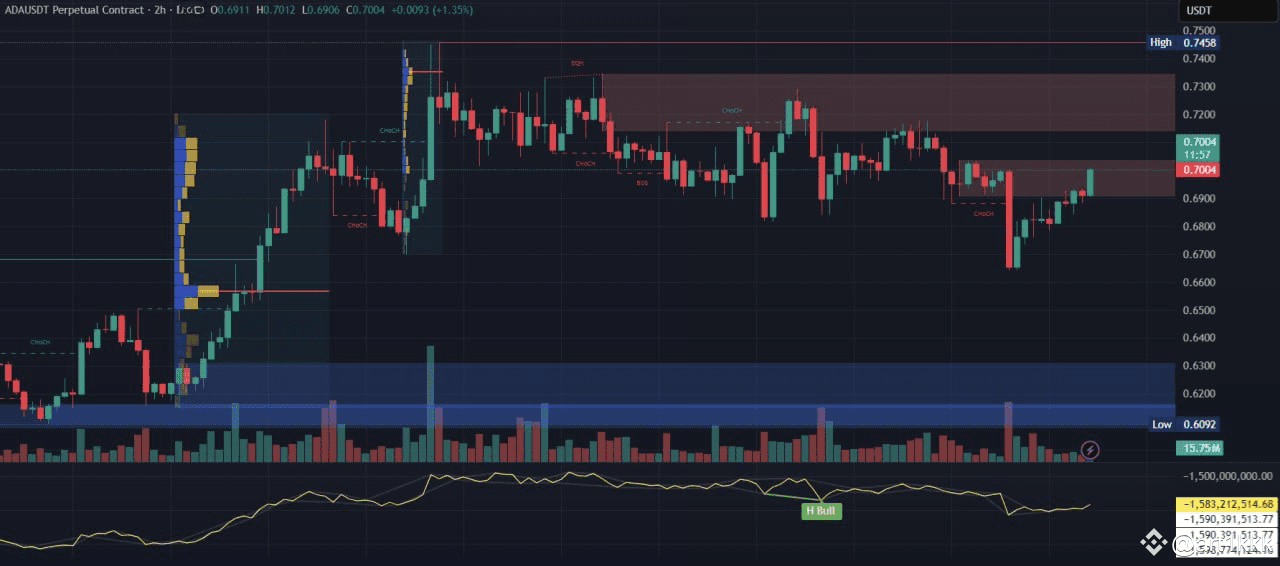 ADA made a strong impulse move from the $0.608–0.625 demand zone, breaking multiple CHoCHs and rallying up to $0.7458, where an Equal High (EQH) formed—indicating liquidity resting above.
