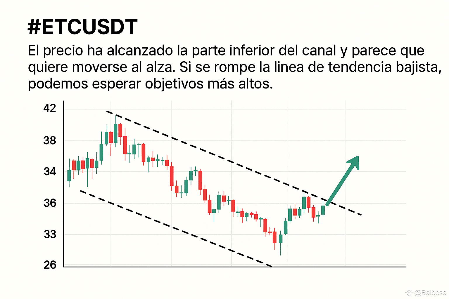 #ETCUSDT El precio ha alcanzado la parte inferior del canal y parece que quiere moverse al alza. Si se rompe la línea de tendencia bajista, podemos esperar objetivos más altos.