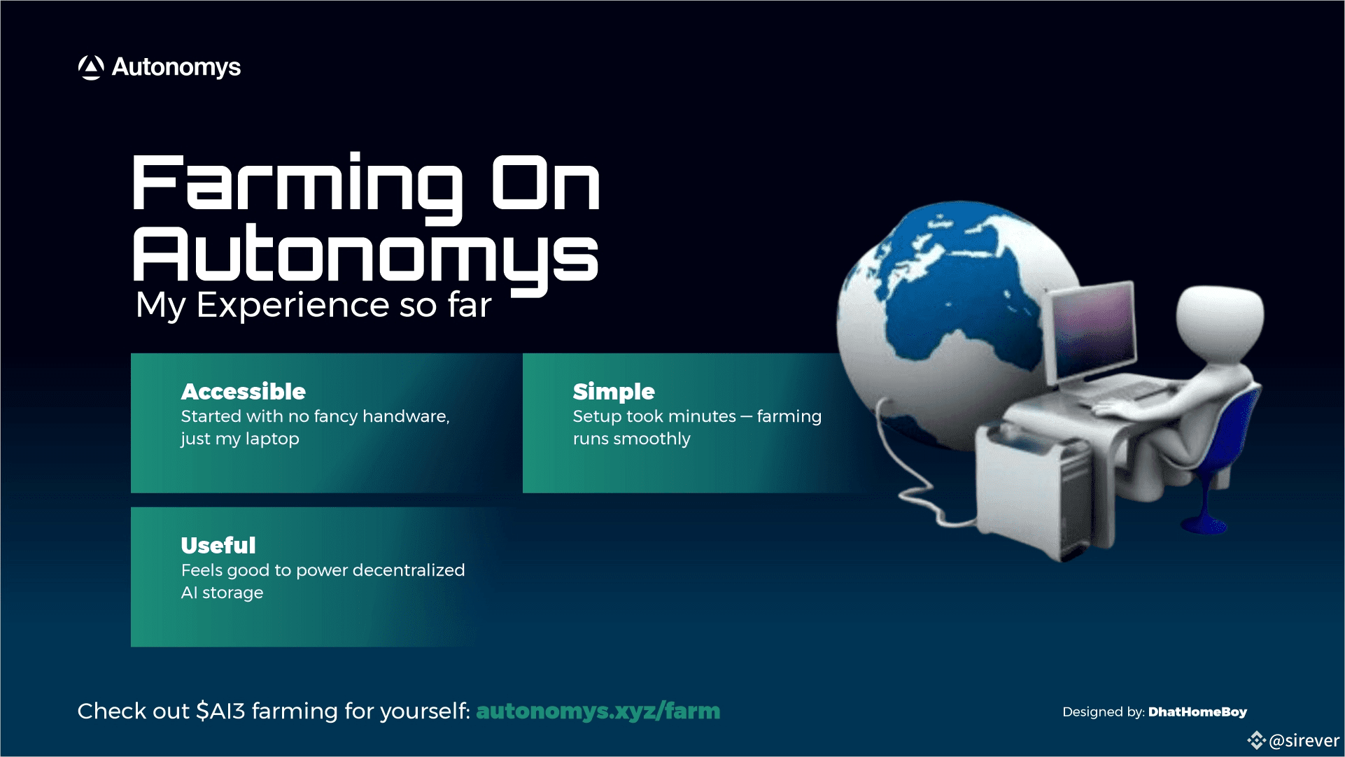Unlike traditional mining or staking models, Autonomys makes participation easy. No need for GPUs or huge capital—just everyday hardware and a willingness to contribute. The setup took less than 10 minutes, and within a day I was already contributing SSD space and earning $AI3.
