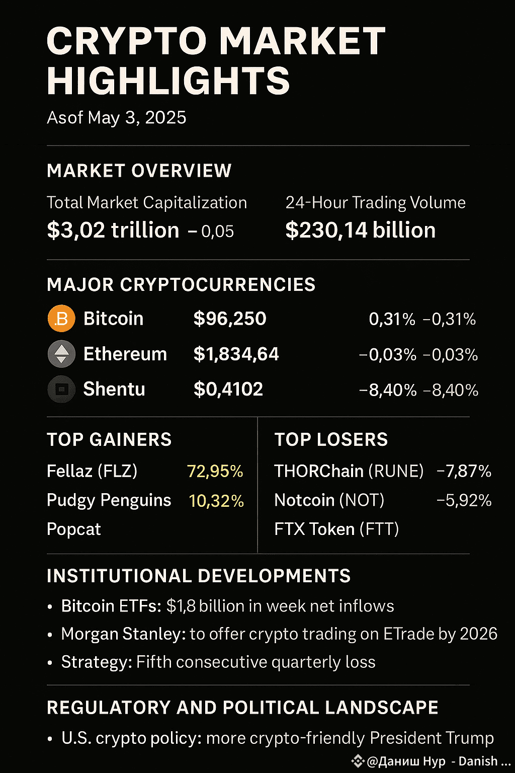 As of May 3, 2025, the cryptocurrency market exhibits a mix of bullish momentum and cautious consolidation. Here's a detailed overview of the current market highlights: