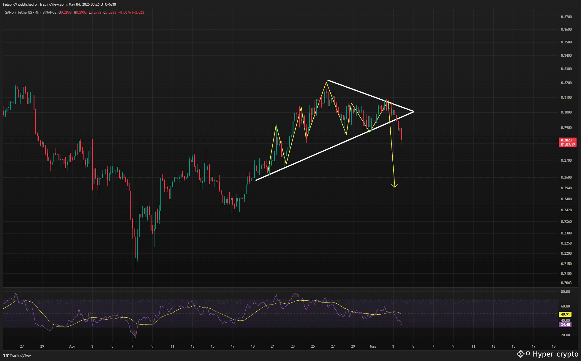 1) This is the SAND 4-hour chart, showing a symmetrical triangle pattern 📉. The price is consolidating within this pattern, with alternating higher lows and lower highs, which suggests that a breakout is imminent. The RSI is at 48.90, showing neutral momentum, but a shift toward the downside is likely given the current pattern and market conditions.