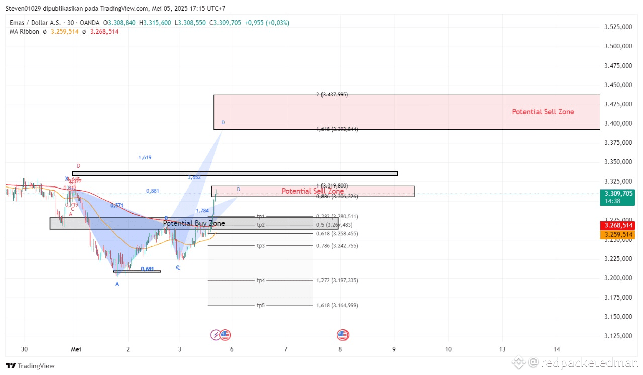 Spotted a bullish harmonic pattern on XAUUSD (30m) that just completed within the Potential Buy Zone, aligning perfectly with Fibonacci confluence and MA Ribbon support. Market has reacted with a clean bounce and is approaching a Potential Sell Zone, which includes two harmonic D-points: