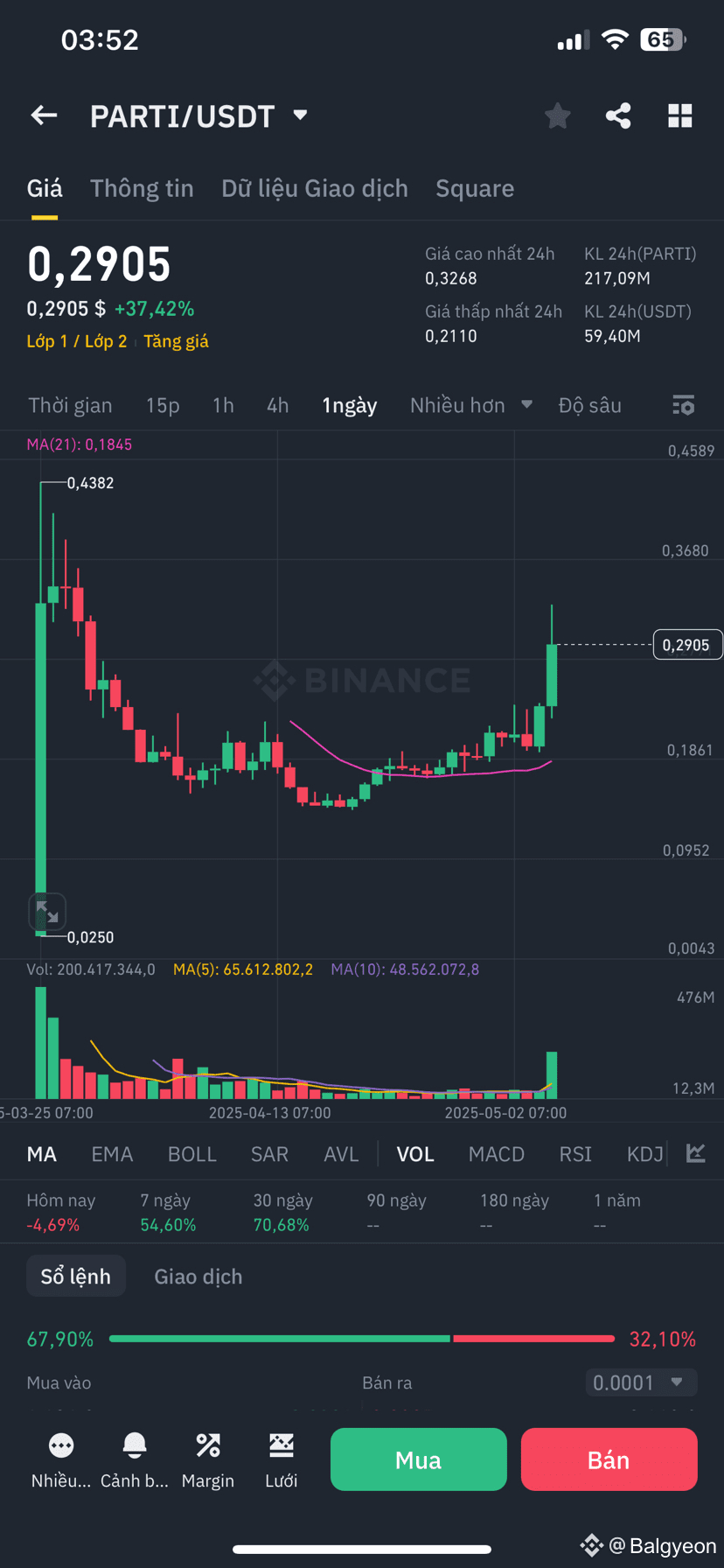 * Giá hiện tại: 0,2905 USDT, vẫn cao hơn MA(21) = 0,1845 → xu hướng ngắn hạn duy trì tăng.