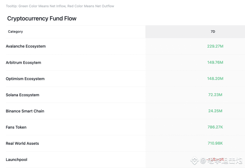 CoinAnk数据显示,过去一周,加密市场按概念板块划分,雪崩生态、Arbitrum生态、Optimism生态、Solana生态、币安智能合约、粉丝代币和Real World Assets这些板块实现资金净流入。