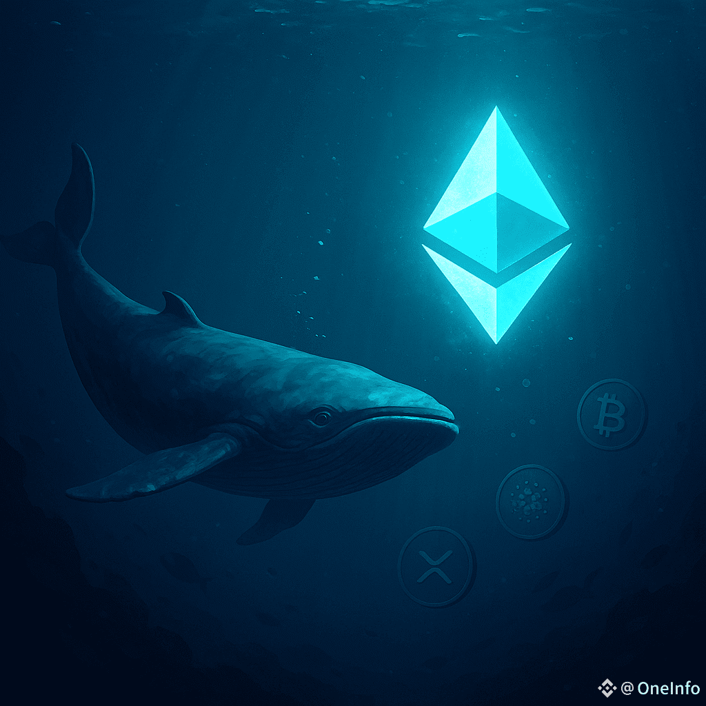 A high-impact graphic showing a massive whale swimming toward a glowing Ethereum logo deep in the ocean, with BTC and other altcoins like ADA and XRP swimming nearby. The scene symbolizes accumulation and momentum building underwater (behind the scenes) before a market surge.