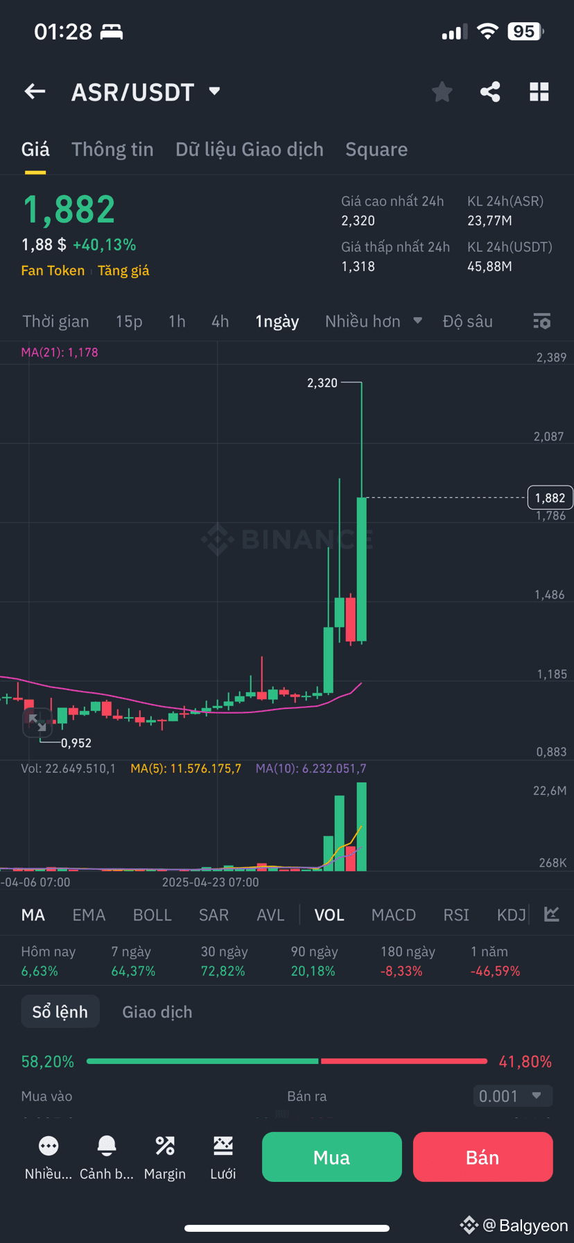 Sau khi chạm đỉnh 2,320 USDT, ASR giảm \~19% về vùng 1,882 USDT. Tuy nhiên, 58% lệnh vẫn là mua, phản ánh tâm lý tích cực. Đây có thể là nhịp nghỉ ngắn trước khi thị trường bật trở lại, nhất là khi AS Roma chuẩn bị đá trận lớn ngày 10/5/2025.