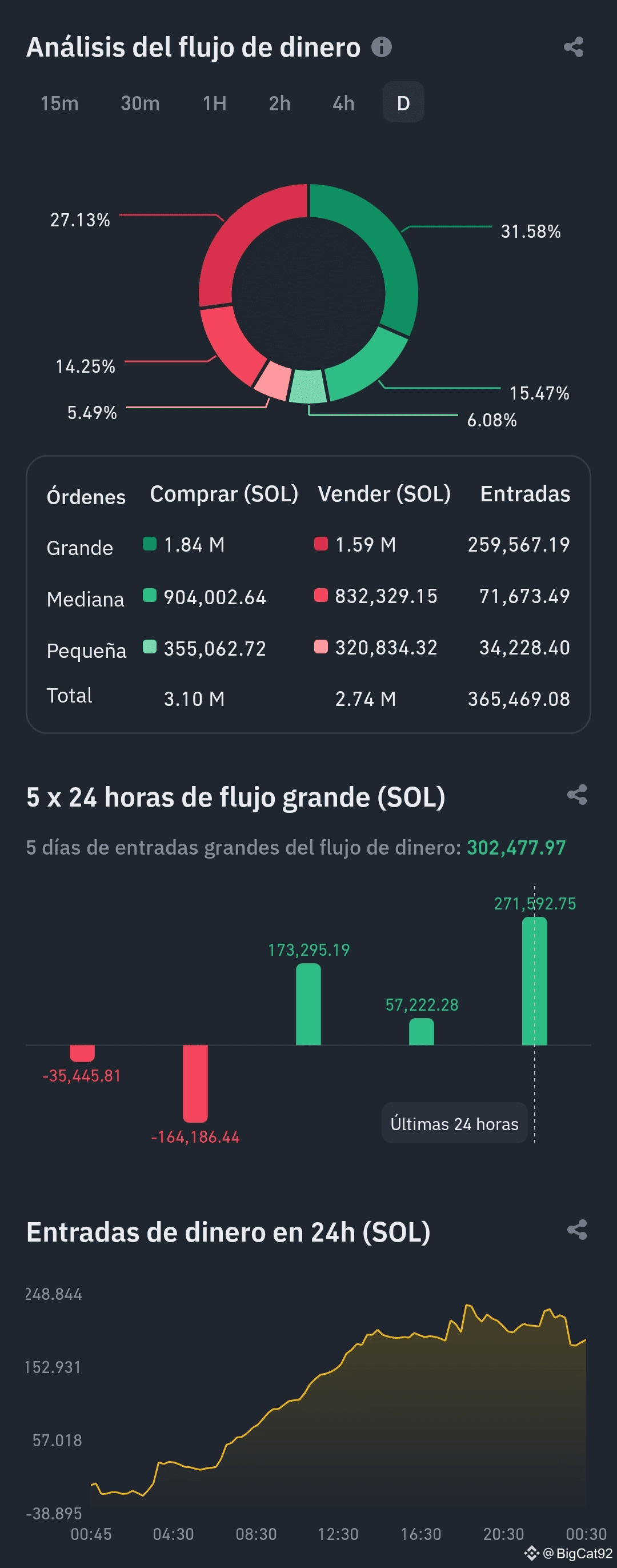 Los grandes felinos del capital están despertando y Solana #SOL parece liderar la cacería. En las últimas 24 horas, los flujos de entrada superan los 365,000 SOL, con un dominio de compras grandes (31.58%) frente a ventas, lo que podría indicar una acumulación estratégica.