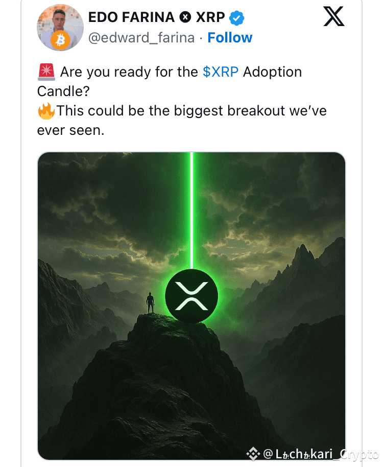 In a recent post on X, Farina prepared the minds of XRP proponents for what he called an ‘XRP Adoption Candle.’ The accompanying image portrays this as a long green candlestick on XRP’s mascot skyrocketing into the sky.