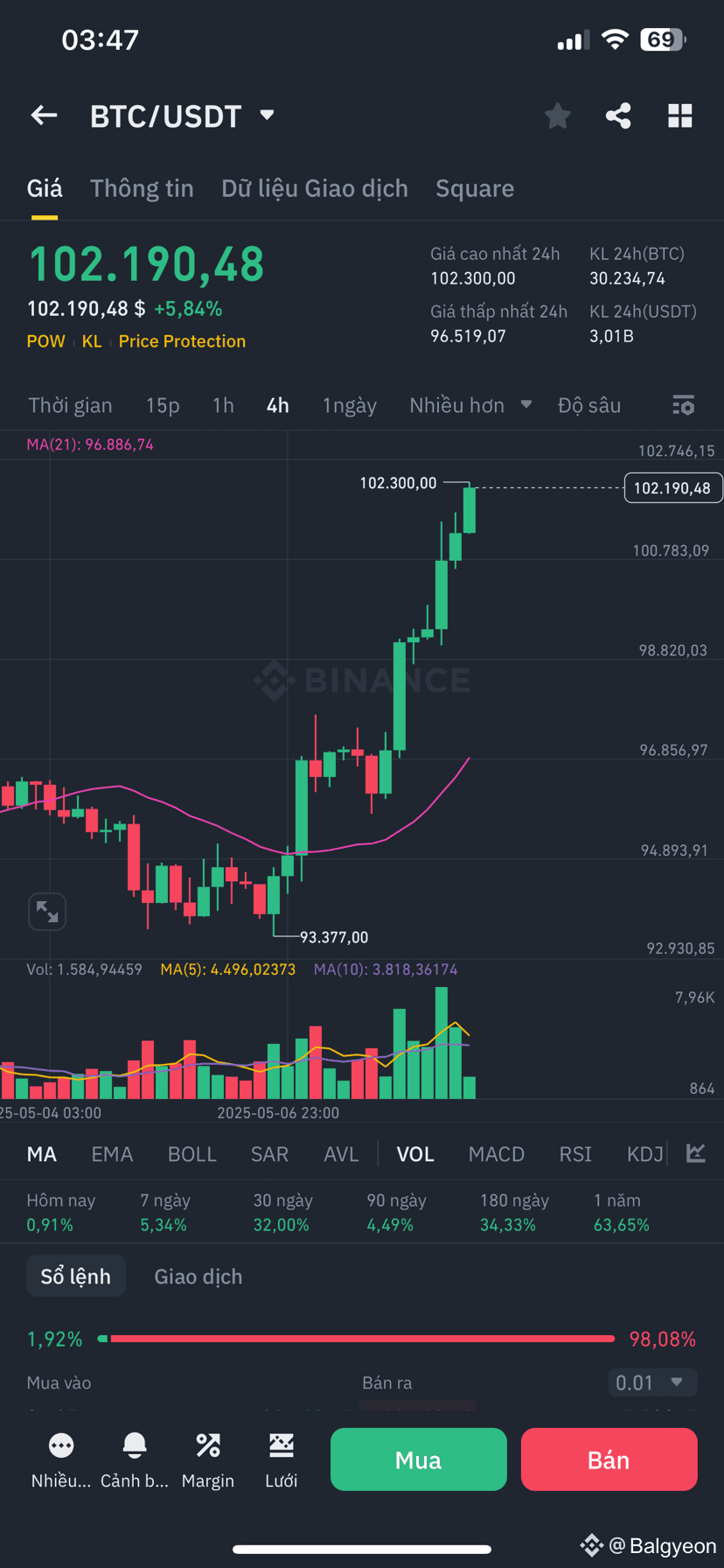 Ngày 09/05/2025, Bitcoin (BTC) chính thức Lại chạm tới cột mốc lịch sử khi vượt qua 100,000 USDT – lần thứ hai đồng tiền số này cán mốc sáu chữ số sau khi có nhịp điều chỉnh trong vài tháng vừa qua . Giá hiện tại: 100,123 USDT, tăng +5,77% trong 24 giờ. Điều gì đang thực sự thúc đẩy làn sóng tăng giá?