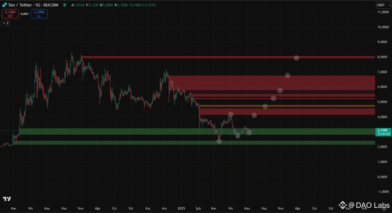 In the last sessions, $TON has continued to remain in volume chart in sustaining a structural shape after a bounce off a key support area. Although volume was low and there was little upward follow-through, the consolidation phase indicates possible strength in an overall uncertain situation. If price action is able to break through the resistance shown in orange then bullish momentum may get going and push the asset towards its next ceiling.-