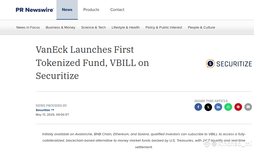 VanEck launched its first tokenized fund VBILL in partnership with Securitize, Solana, Ethereum, $BNB Chain, and Avalanche.