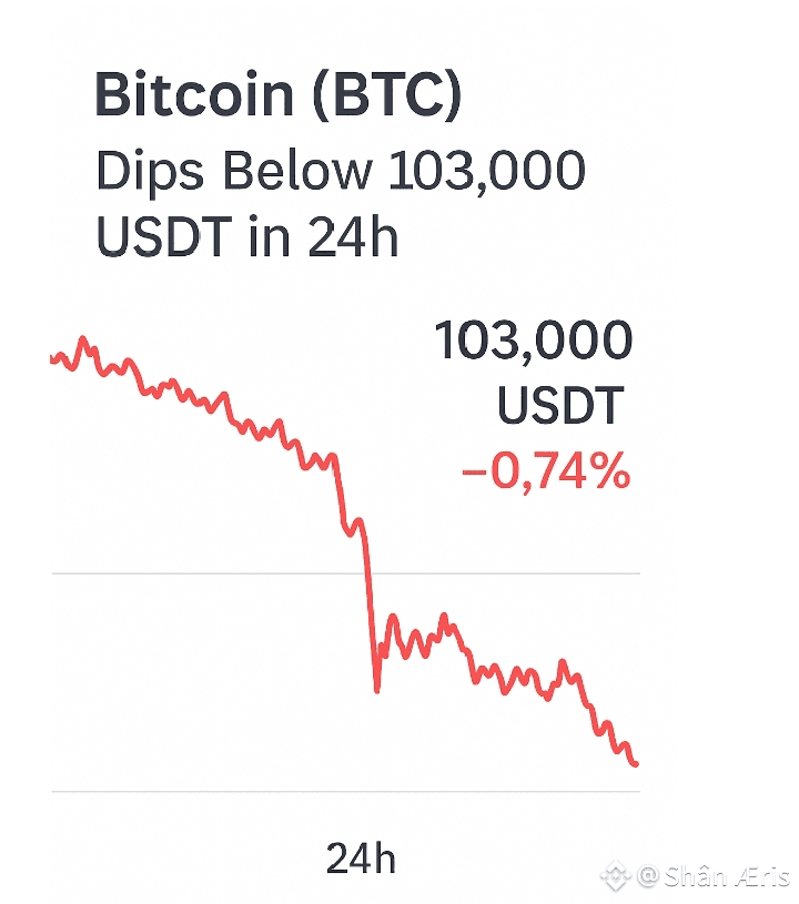 Bitcoin$BTC (BTC) has dipped below 103,000 USDT, marking a 0.74% decline over the past 24 hours. The price drop reflects broader market caution, with BTC sliding 0.90%. Despite recent gains, investor sentiment appears mixed. Bitcoin's$BTC short-term trajectory remains uncertain amid ongoing volatility.$BTC