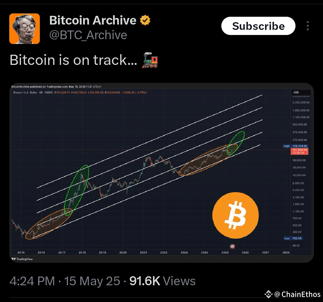 On May 15, 2025, a post from @BTC_Archive on X, garnering 91.6K views, shared an optimistic outlook for Bitcoin (BTC), stating, "Bitcoin is on track..." Accompanied by a detailed chart from TradingView, the post suggests that Bitcoin is poised for a significant upward movement. Let’s break down the chart and the implications for BTC’s price trajectory.
