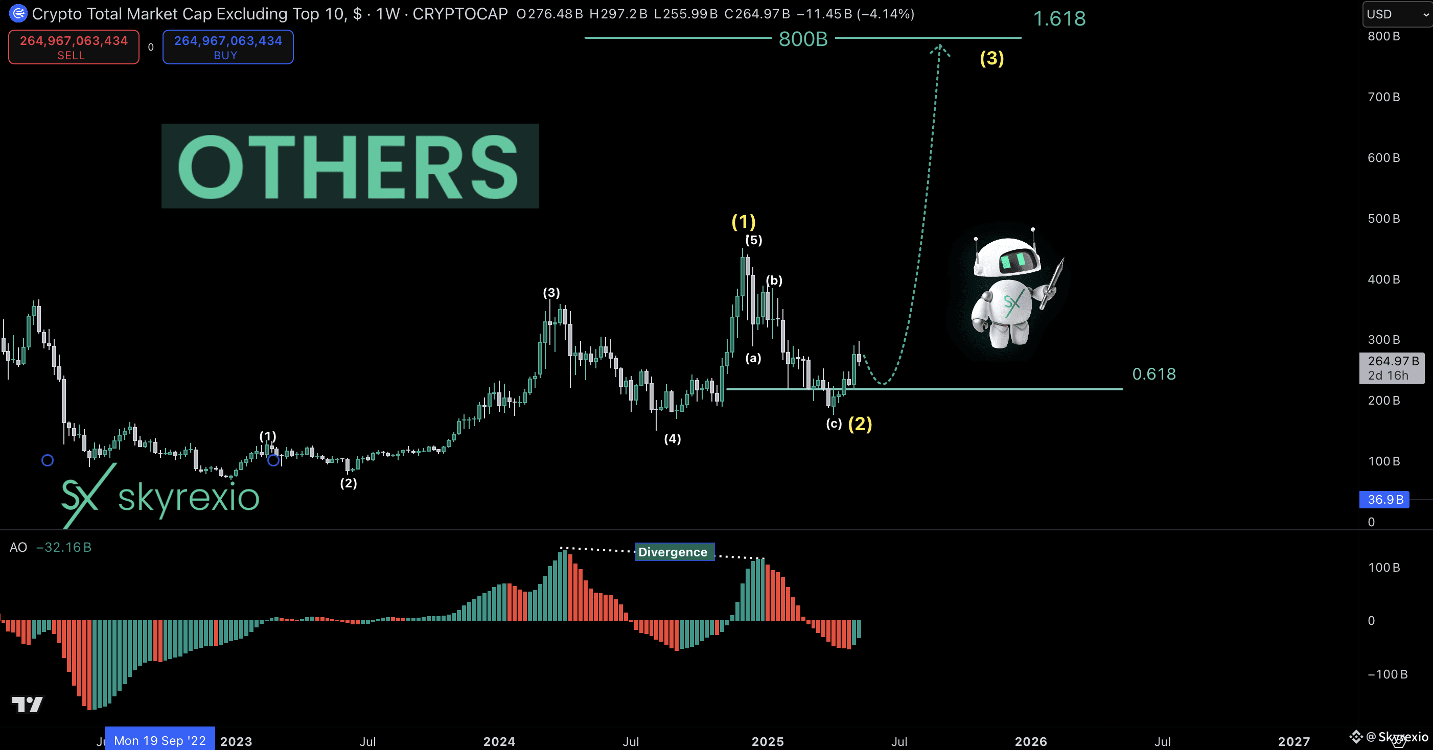 Let's take a look at the weekly chart. Awesome Oscillator shows that the wave 1 has been finished in December 2024. Now this chart is in wave 2. The target area 0.61 Fibonacci has been reached, but here I have 2 possible scenarios. The first one price will grow a little bit and retest recent low and the second one is that wave 2 is finished already and we are in global wave 3. Both these scenarios are about some kind of wave 2 and the growth in wave 3 to 800B is imminent anyway.