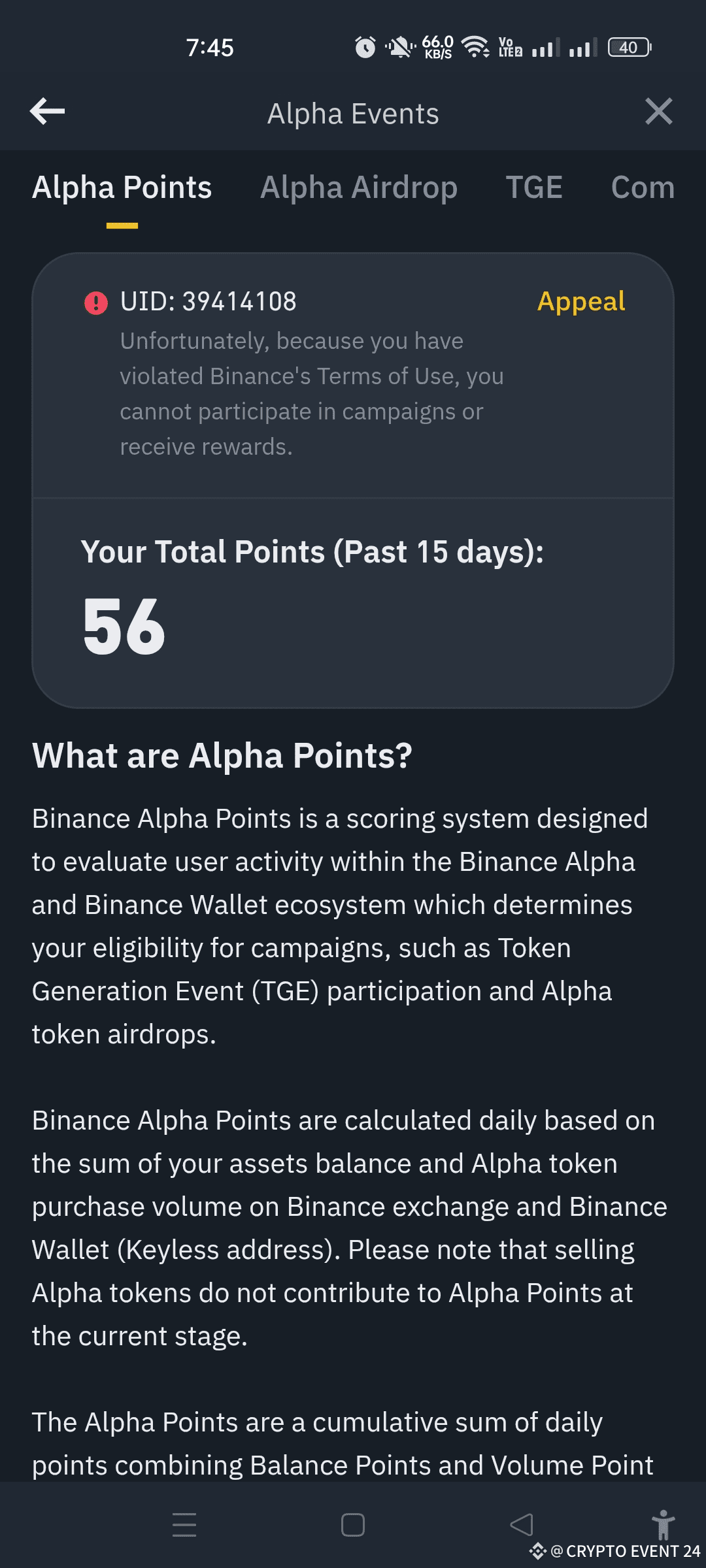 Unfortunately, because you have violated Binance's Terms of Use, you cannot participate in campaigns or receive rewards.