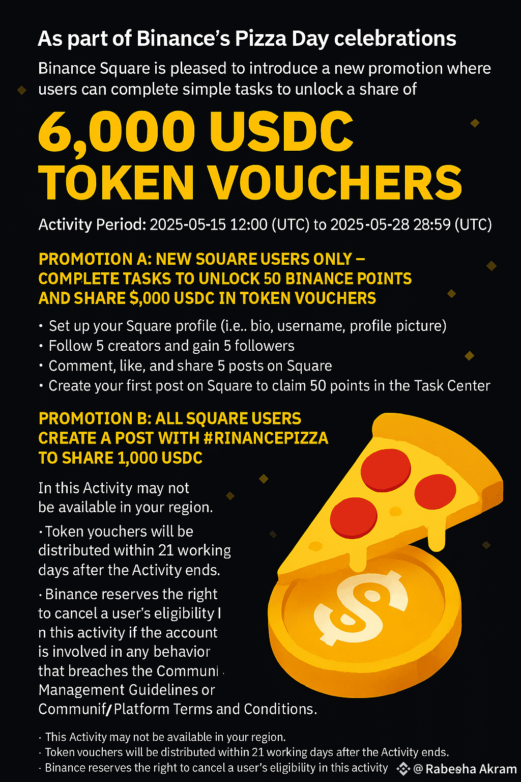 As part of Binance’s Pizza Day celebrations, Binance Square is pleased to introduce a new promotion where users can complete simple tasks to unlock a share of 6,000 USDC token vouchers.