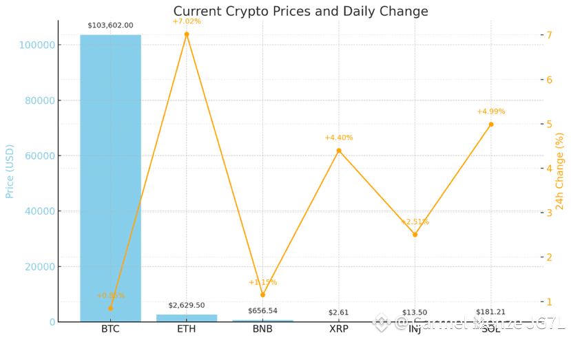 Here’s a visual chart showing the current crypto prices along with their 24-hour percentage changes. Let me know if you’d like a version with more coins, historical trends, or different visual styles! $BTC ##cryptoprize #CryptoRegulation $BNB $BTC