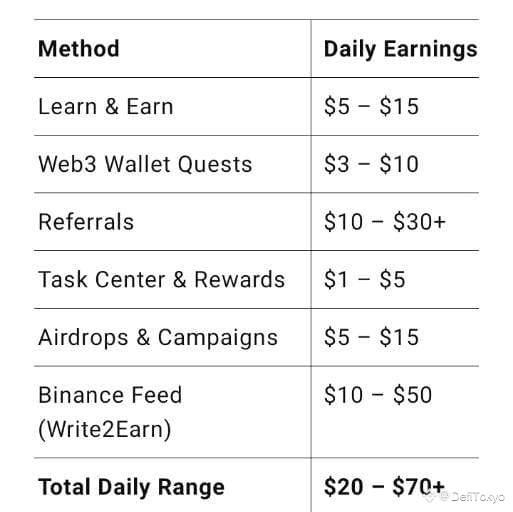6. Join Binance Feed Competitions (Write2Earn) If you are skilled at writing or sharing cryptocurrency insights, join content challenges on Binance Feed. Steps: Open the Binance app > Feed Create posts or articles on trending topics of your choice, you will receive a reward in USDT or gift vouchers. Earning potential: $10 - $50 per article/post, depending on the competition rules and quality. --- Daily earnings summary ---