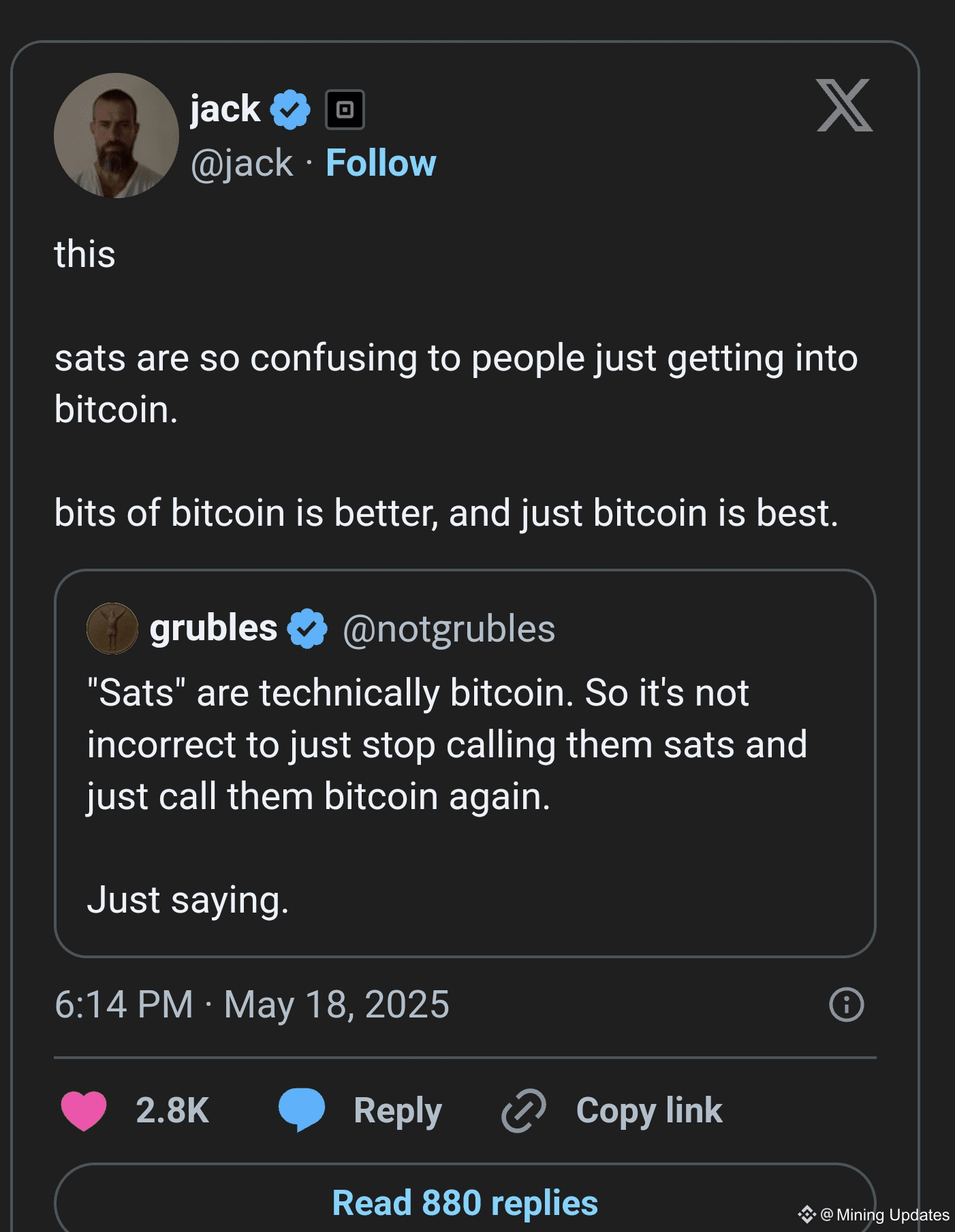 Генеральний директор Block Inc. Джек Дорсі викликав гарячу дискусію в криптоспільноті, підтримавши ідею відмовитися від терміна «сатоші» на користь назви мінімальної одиниці просто «біткоїн». Про це він заявив 18 травня 2025 року в соцмережі X, коментуючи пост користувача