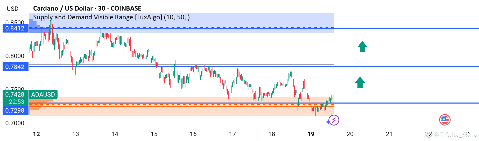 Two major resistance levels lie ahead at $0.7842 and $0.8412 – both previously tested supply zones. If ADA can maintain its current bullish momentum and break above $0.75 with volume, we could see a short-term rally toward these key zones.