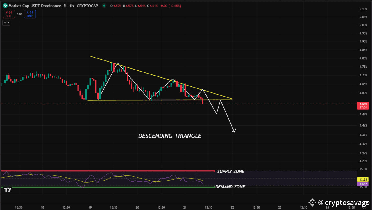 On the 1-hour timeframe, USDT.D is forming a descending triangle — a typically bearish pattern. If it breaks below the lower trendline, it could signal increased risk appetite, potentially triggering a bullish move across the crypto market.