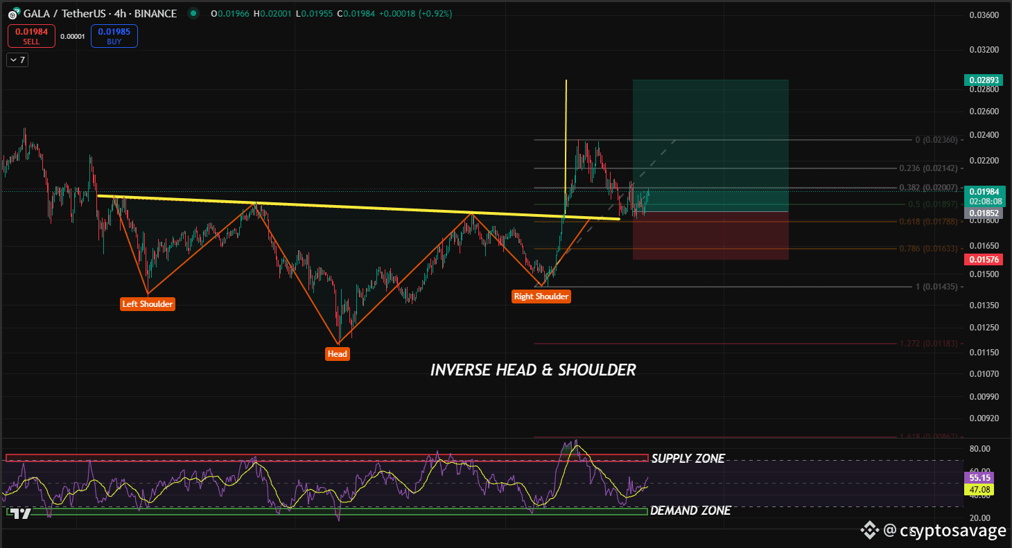 On the 4-hour timeframe, GALA has formed an inverse head and shoulders pattern, which is a bullish reversal setup. The price has already broken above the neckline and completed a successful retest around the 0.5 Fibonacci level. Additionally, the RSI is holding at the demand zone, showing a bullish divergence — further reinforcing the strength of this area as a buyer’s territory.