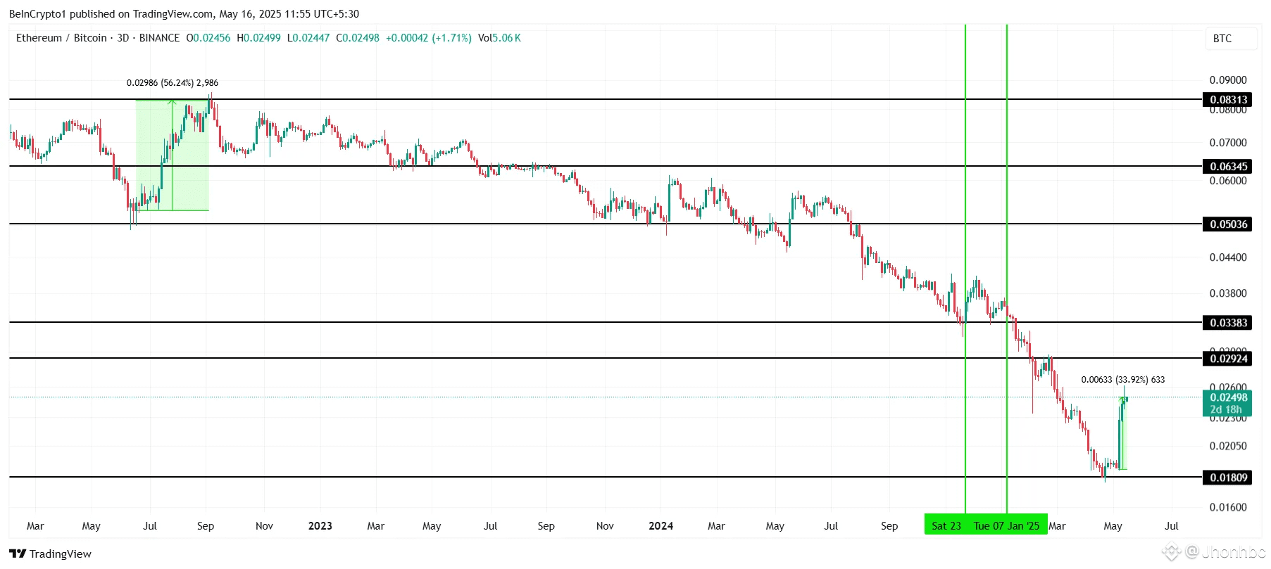El par ETH/BTC ha registrado su primera ruptura desde diciembre de 2024. Por primera vez en cinco meses, el par mostró un mínimo más alto, lo que generalmente se considera una señal de tendencia alcista. Esta ruptura es significativa, marcando un aumento del 34% en solo una semana.
