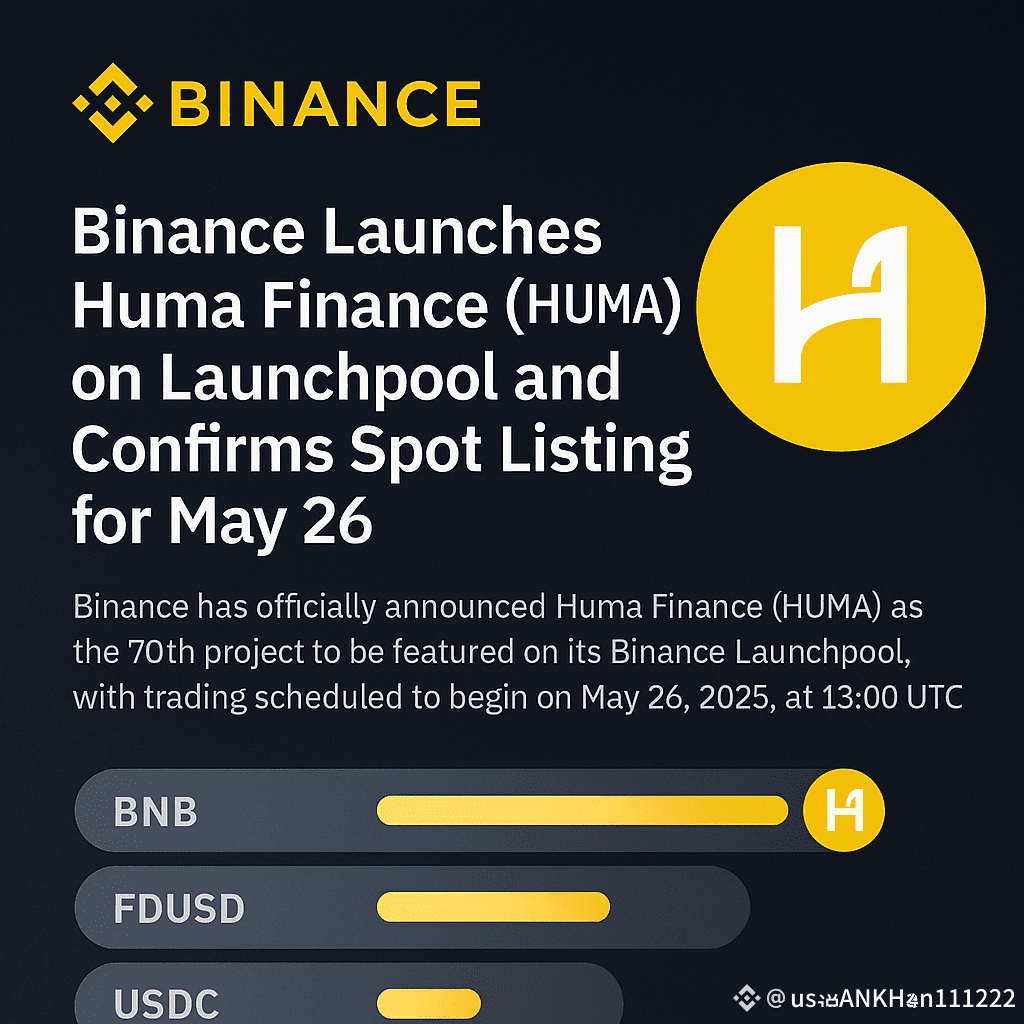 Binance has announced Huma Finance (HUMA) as the 70th project on Binance Launchpool, with spot trading set to commence on May 26, 2025, at 13:00 UTC. Users can farm HUMA tokens by staking BNB, FDUSD, or USDC during a 3-day farming period starting May 23, 2025.