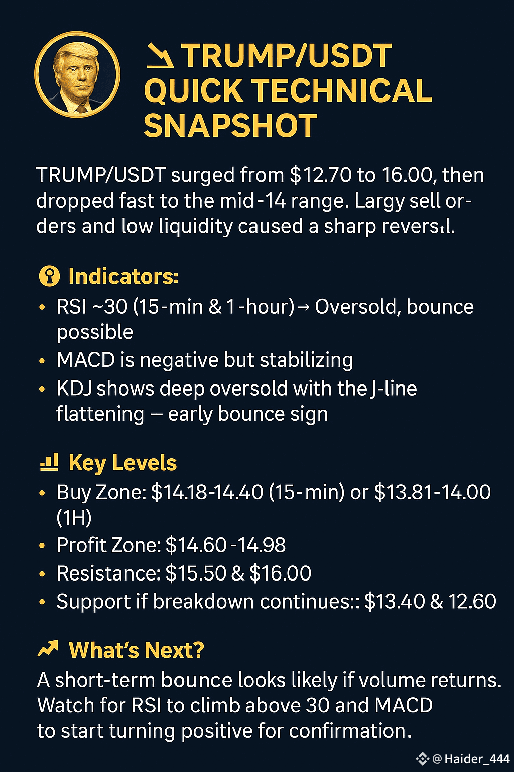 Let’s dive into what’s really going on with TRUMP/USDT. The pair pumped hard from around **\$12.70** to a 24-hour high near **\$16.00**, then dropped like a rock back into the mid-14s. Here’s the breakdown — what caused the move, where we’re headed next, and the key levels every trader should be watching.