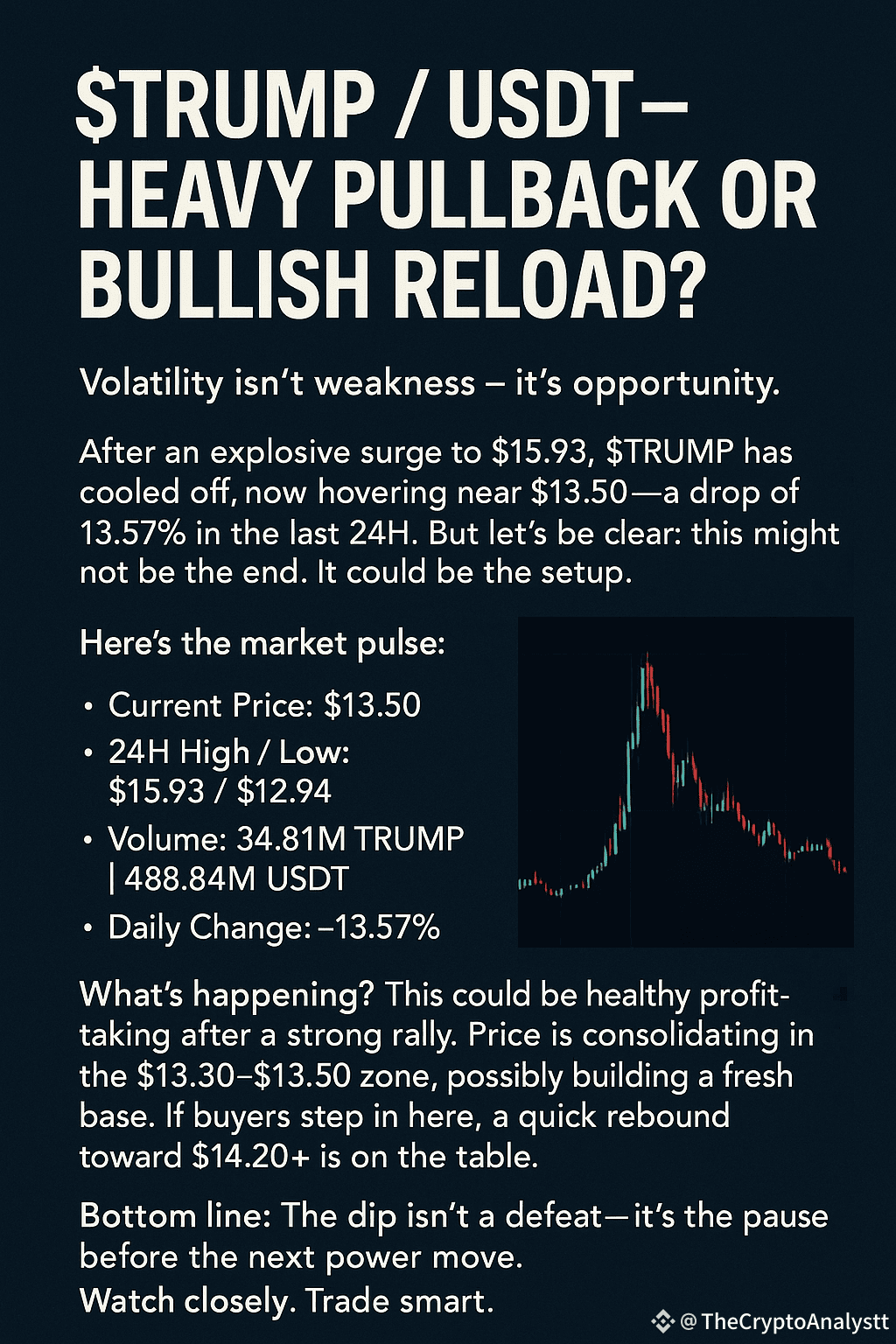 After an explosive surge to $15.93, $TRUMP has cooled off, now hovering near $13.50—a drop of 13.57% in the last 24H. But let’s be clear: this might not be the end. It could be the setup.