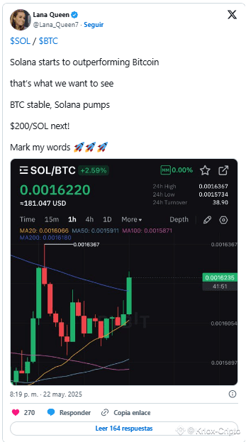 «Solana comienza a superar a Bitcoin. Eso es lo que queremos ver. BTC estable, Solana sube. ¡SOL a $200 a continuación! Recuerda mis palabras».