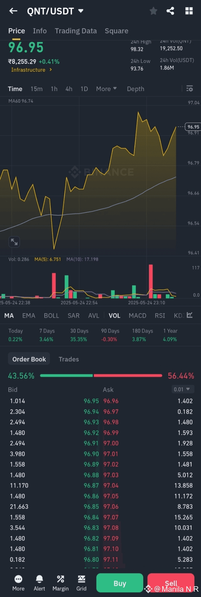 As of May 25, 2025, Quant ($QNT ) is trading at approximately $96.89 USDT , with an intraday high of $98.13 and a low of $94.26