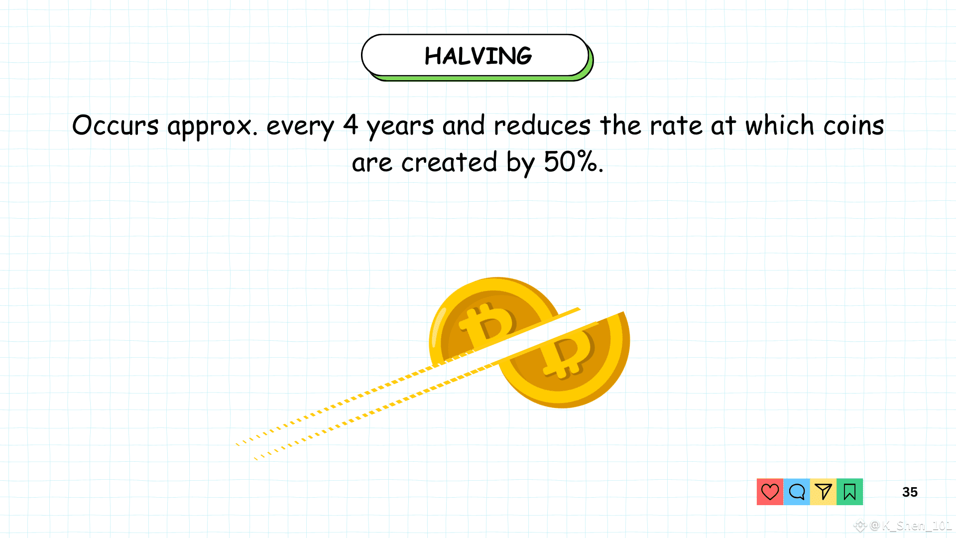 Halving is when the reward miners get for adding new blocks to the blockchain gets cut in half. It happens on networks like $BTC and reduces how fast new coins are created making the asset more scarce over time.