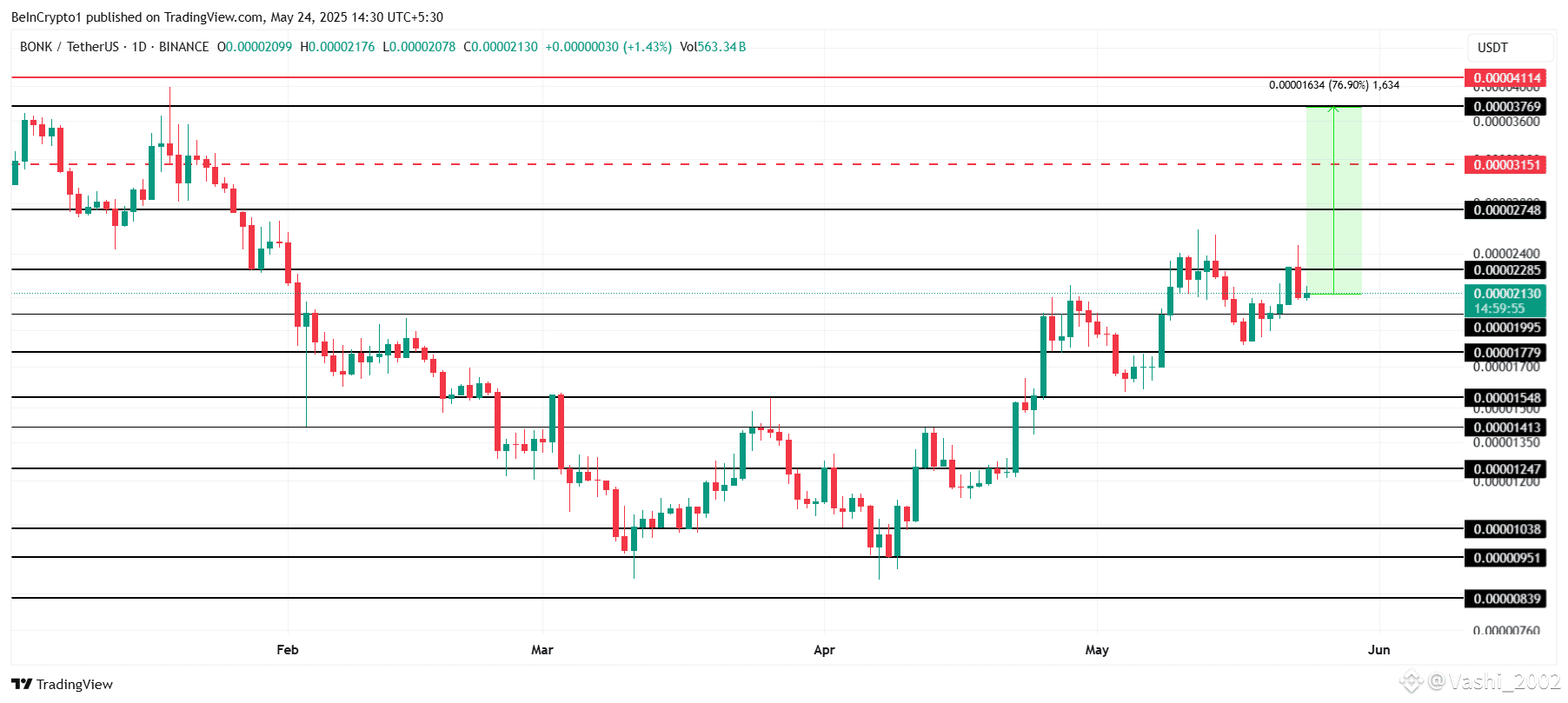 Currently, BONK trades at $0.00002130 and faces resistance at $0.00002285. To fully recover the losses recorded since the start of 2025, BONK must climb approximately 77%, reaching $0.00003769.