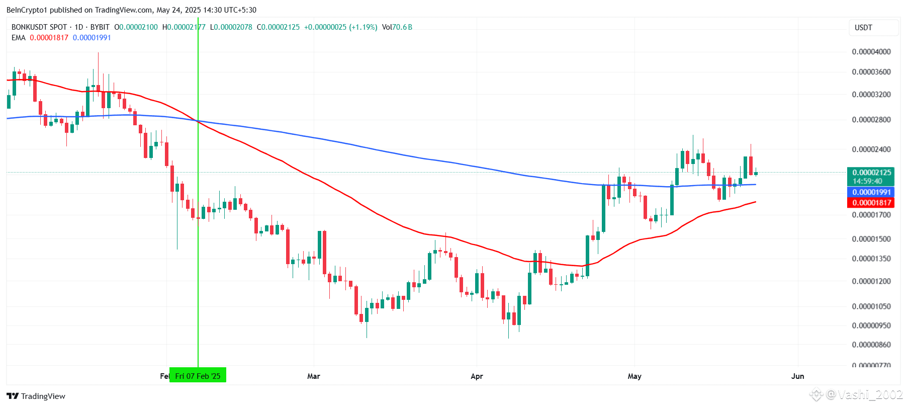 Technical analysis reveals BONK is approaching a Golden Cross, as the 50-day EMA nears overtaking the 200-day EMA. This crossover is widely regarded as a strong bullish signal, often triggering upward momentum.