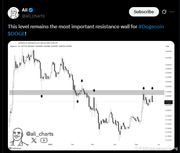 The price has struggled to push past $0.25 despite multiple attempts. A recent analysis highlights that this threshold is key for confirming a potential uptrend. Failure to break through has kept Dogecoin under bearish pressure, with its value hovering near the lower end of its current range.