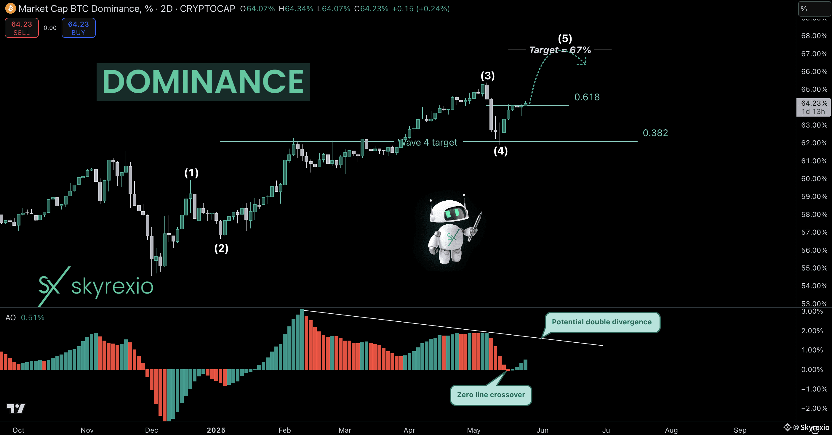 Let's go to Elliott waves. As I told you wave 4 has been finished at 0.38 Fibonacci level and with the Awesome Oscillator cross of the zero line. Now it's time for wave 5. Target is the same equals 67%. Only when we see this price and the double divergence we have a chance that liquidity will transfer from Bitcoin to altcoin. Next 2 weeks will be disaster for all altcoins holders.