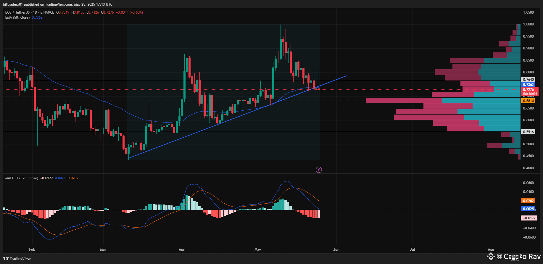 $EOS is showing clear signs of weakness after breaking down from its uptrend channel, signaling a bearish shift just ahead of the new weekly open. The price is currently trading below both the Value Area High (VAH) and the 50-day EMA, reinforcing downside pressure. Additionally, the MACD indicator is flashing bearish momentum, suggesting further losses may be ahead. If the broader market experiences even a minor pullback, EOS could likely revisit its Point of Control (POC) at $0.683 on the daily chart. Given the technical breakdown and market structure, a short position on EOS appears to be the more favorable setup in the near term.