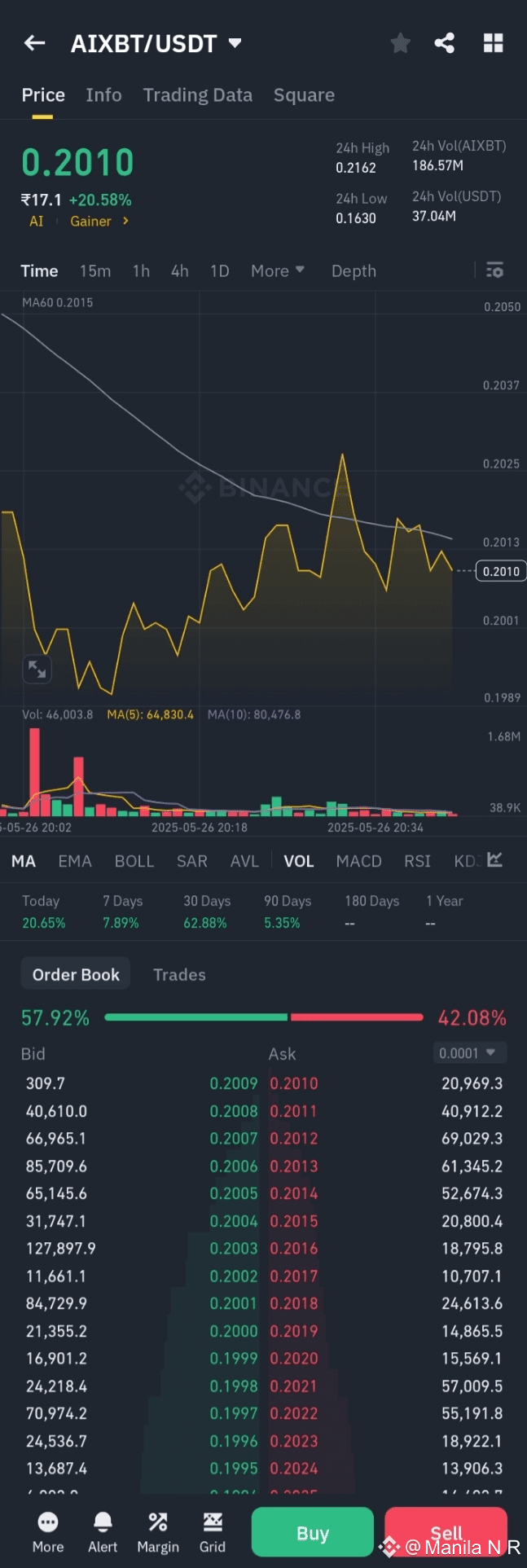 As of May 27, 2025, $AIXBT by Virtuals is trading at approximately $0.2018, reflecting a 21% increase over the past 24 hours . The token has a circulating supply of 928 million and a market cap of around $186 million .