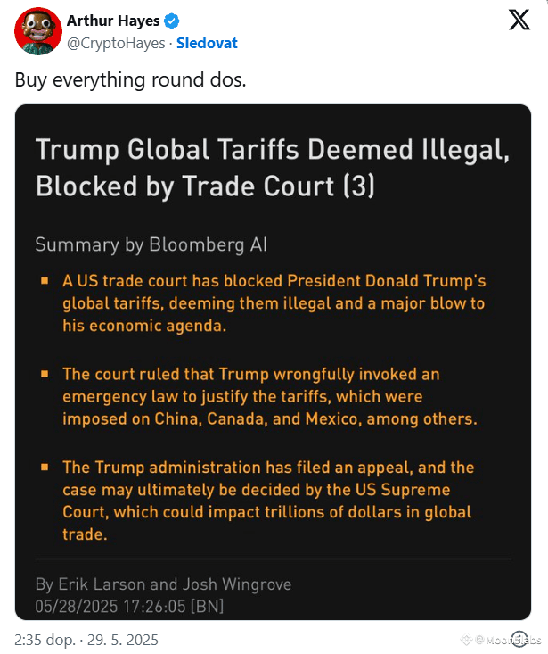 The decision immediately sparked intense debate across financial markets. Some see it as a positive signal for global trade relations, while others warn of looming instability. Meanwhile, crypto veteran and former BitMEX CEO Arthur Hayes has no doubts: now is the perfect time to buy everything. 💥