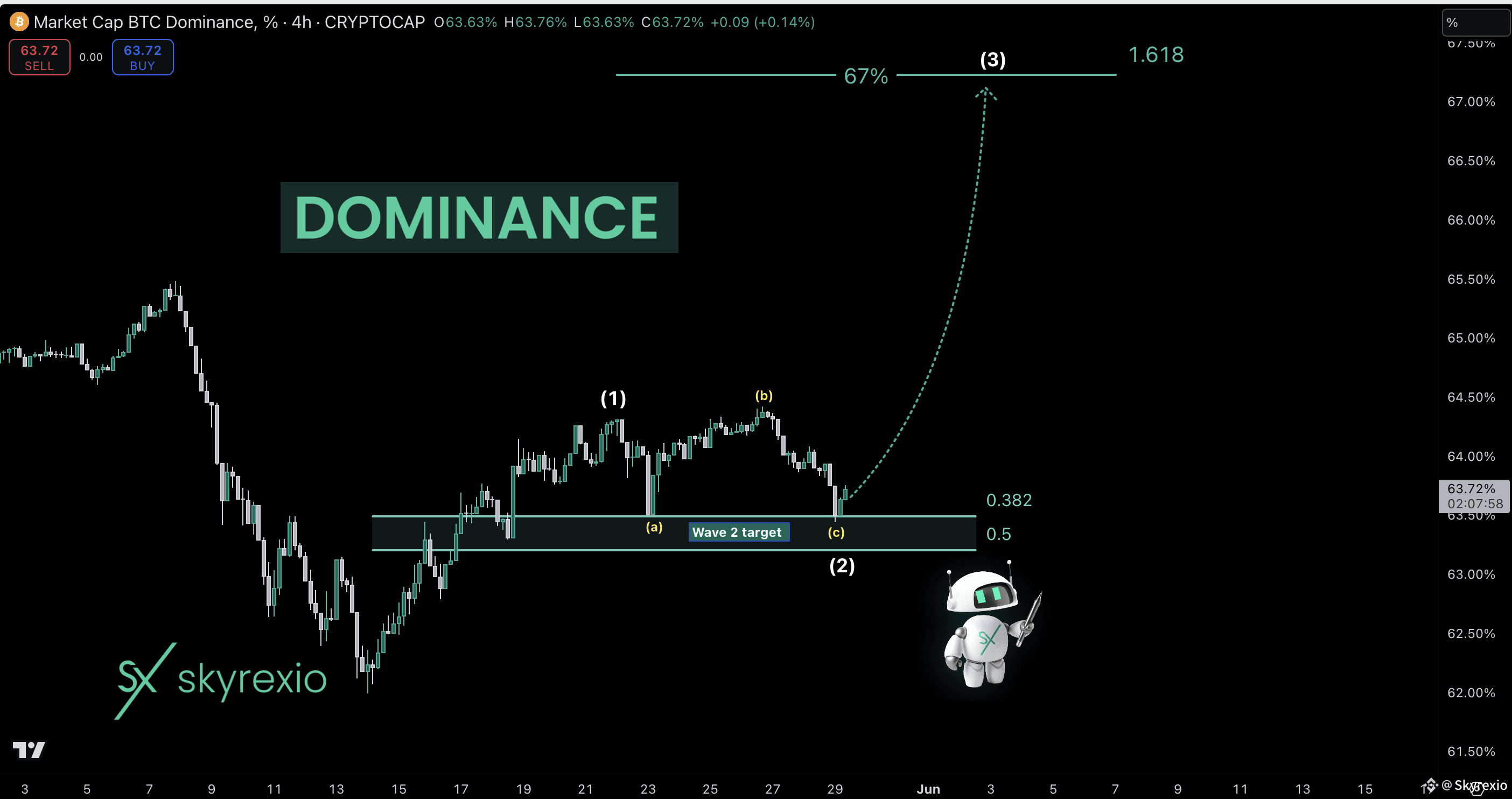 Look at the 4h time frame. As you remember from my previous analysis I expect the global wave 5. In my opinion waves 1 and 2 have been finished already. Wave 2 represented as an irregular ABC correction. Target at 0.38 Fibonacci has been reached. Now it's time for wave 3 which will reach 67%. During this dump on altcoins I wanna see total disappointment of moon boys and selling on every local bounce. I will repeat once more, market shall be cleared from the crowd to go up.