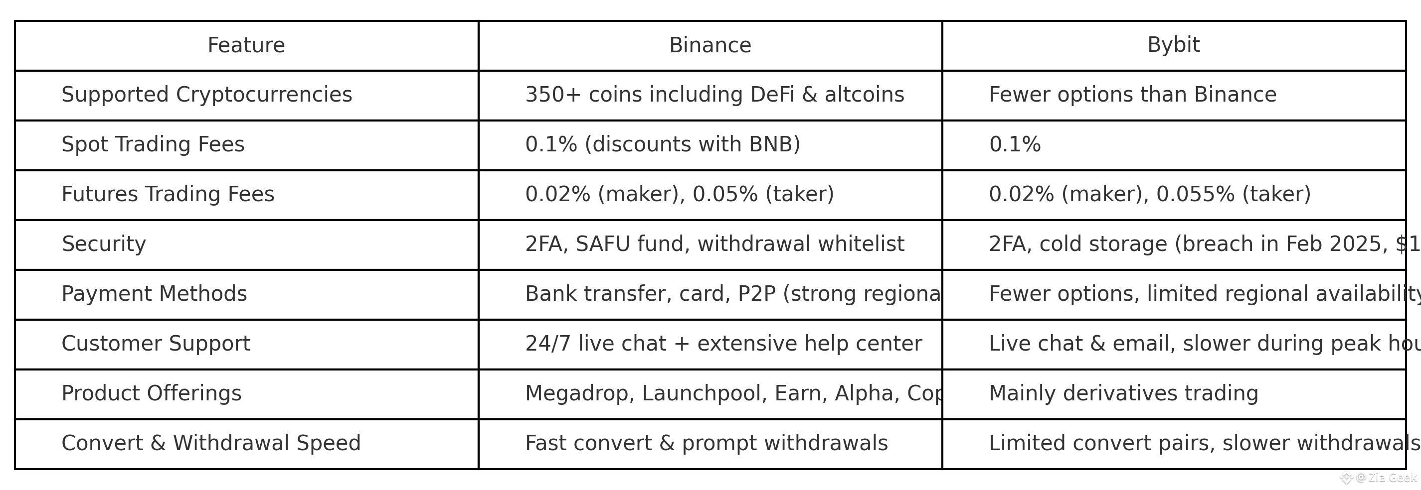 Bybit: Focuses primarily on derivatives trading, with fewer additional product offerings compared to Binance.