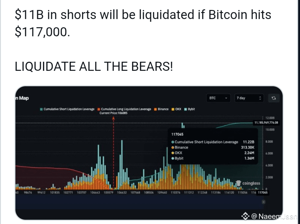 A massive $11 billion in short positions could be wiped out if Bitcoin (BTC) reaches the $117,000 mark, according to the latest on-chain and derivatives data. This potential liquidation level has sparked intense discussion among traders and analysts, as it represents a major psychological and technical milestone for the crypto market.