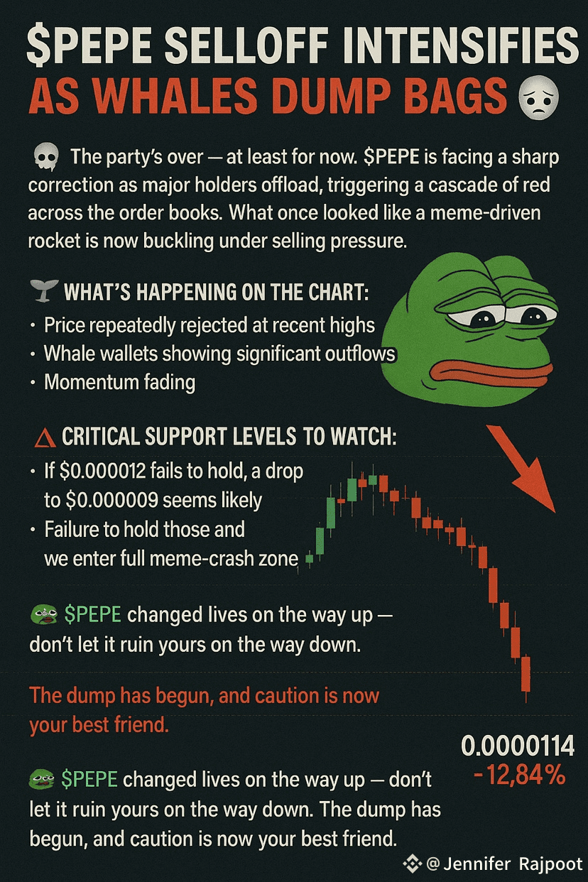 💀 The party’s over — at least for now. $PEPE is facing a sharp correction as major holders offload, triggering a cascade of red across the order books. What once looked like a meme-driven rocket is now buckling under selling pressure.