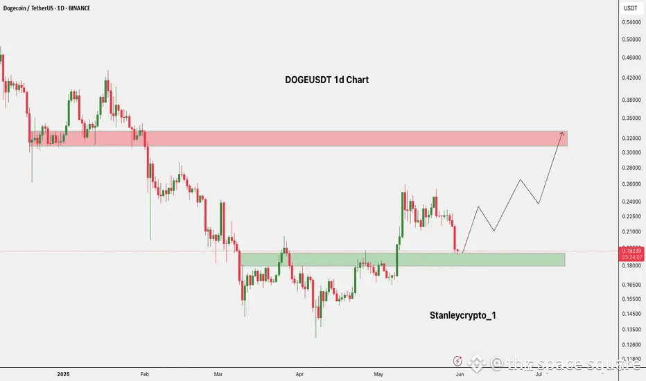 The #DOGEUSDT 1D chart shows price testing a strong support zone around $0.18–$0.19.